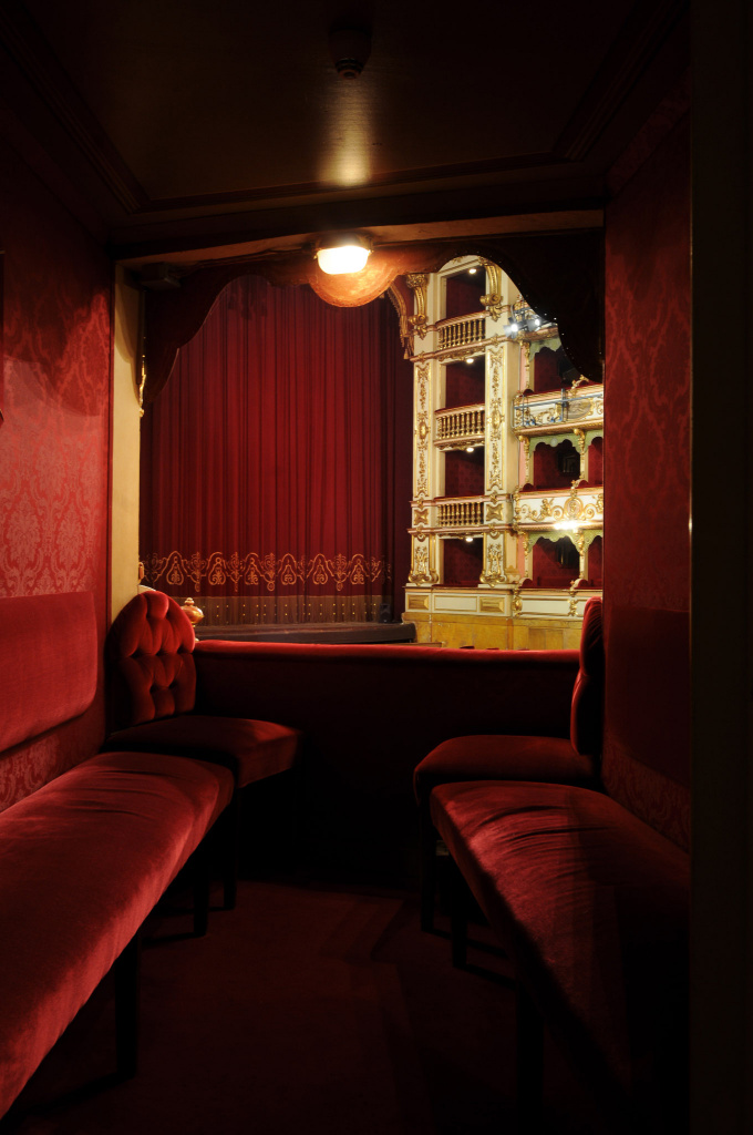 L’interno dei palchi è rivestito di un appropriato tessuto nella tradizionale tinta rosso-granata. Dello stesso colore sono i velluti imbottiti che rivestono le panche ed i poggiaschiena, dall’originaria struttura lignea. Completano l’arredamento le placche portaspecchio e gli appendiabiti.