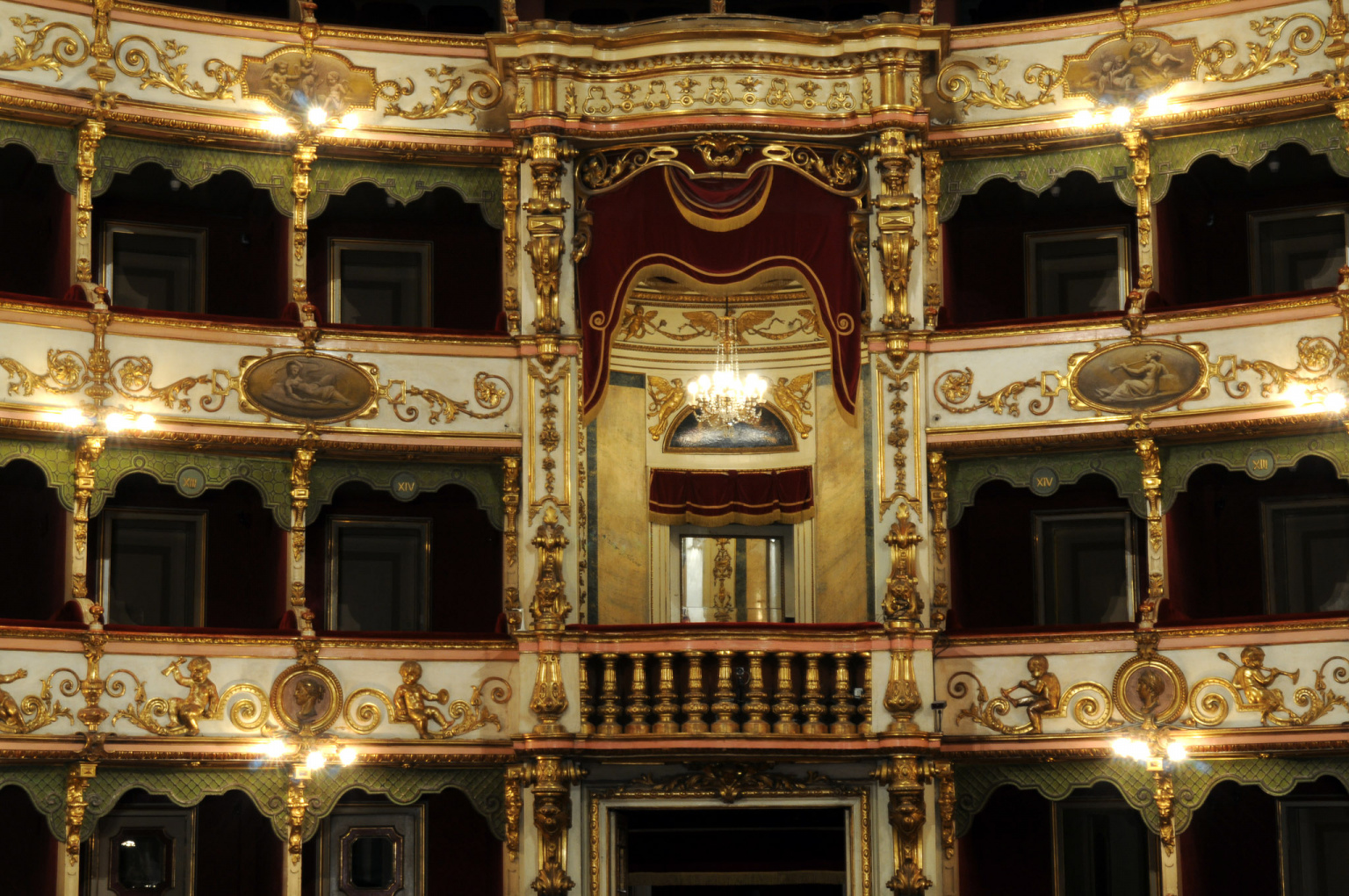 I toni cromatici che creano un meraviglioso colpo d’occhio all’ingresso dello spettatore nella sala sono il rosso granata (delle poltrone di platea, della tappezzeria e dei sedili dei palchi), l’avorio e l’oro (delle strutture dei palchi e delle varie decorazioni in legno intagliato e cartapesta).